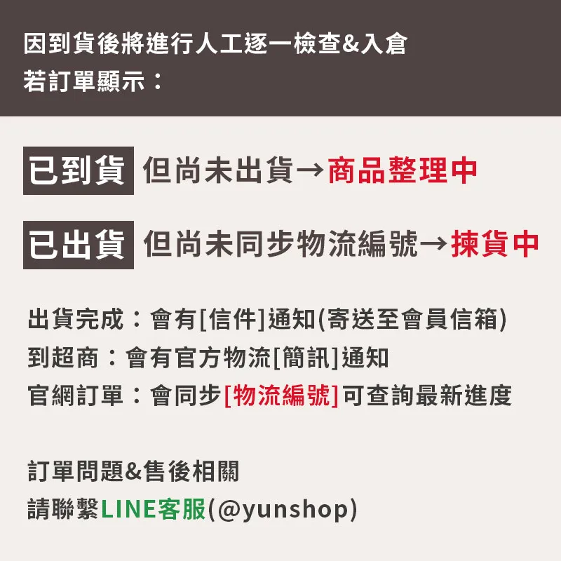 訂單顯示「已到貨」但尚未出貨代表商品已到倉,目前正在逐一整理會在出貨時才按下出貨