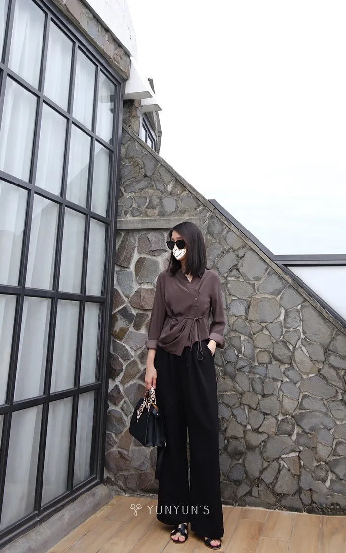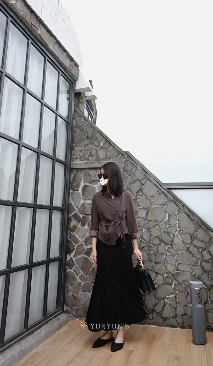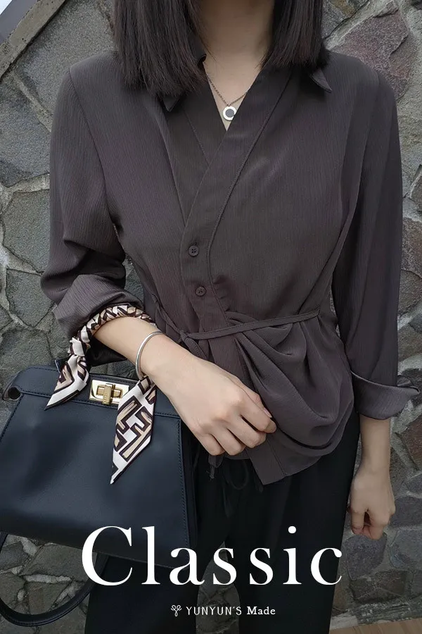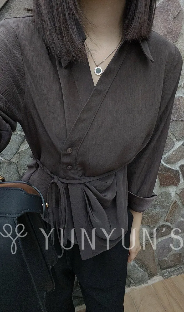 特殊灰|YUN升級夏季超涼爽親膚抓皺綁帶不規則襯衫