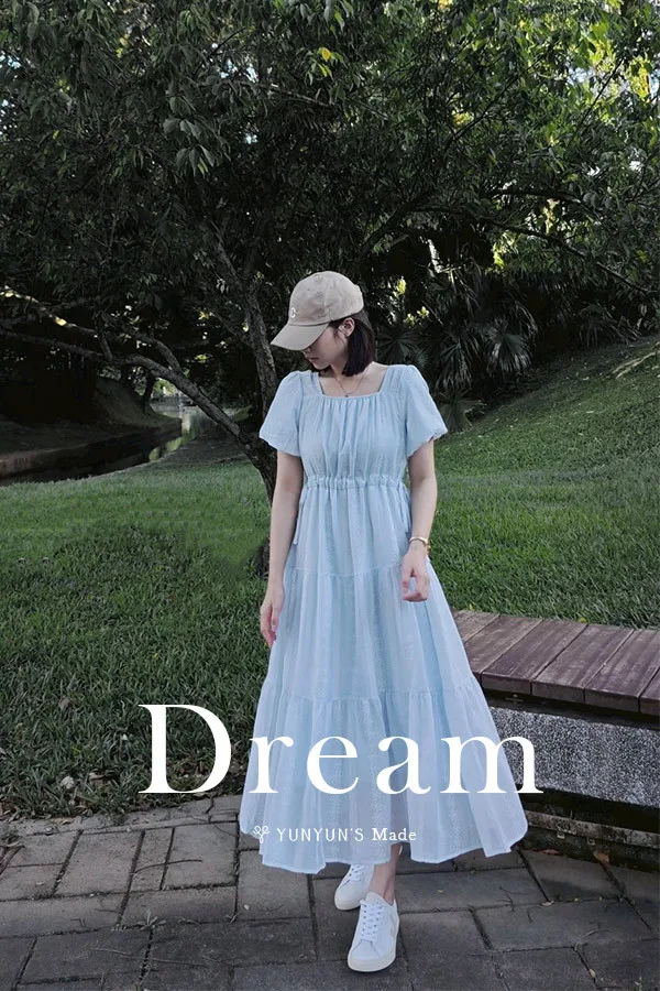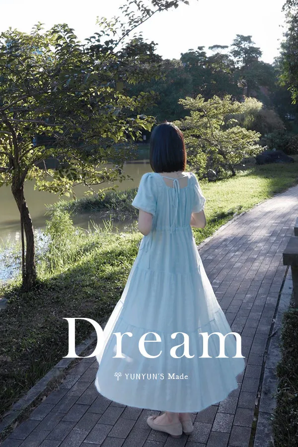 ・正面是故意做比較合一點的方領(胸前那段有鬆緊),穿起來修飾肩膀,腰圍是兩側自己綁的抽繩、下擺散裙(有內裡不會透)、背面上面有綁帶裝飾