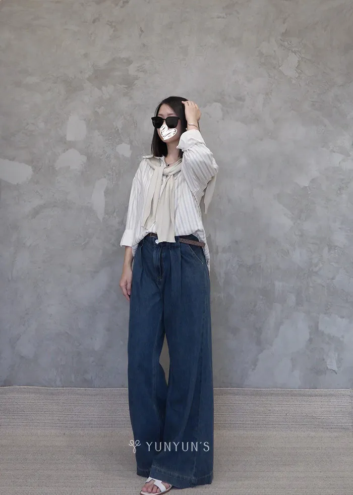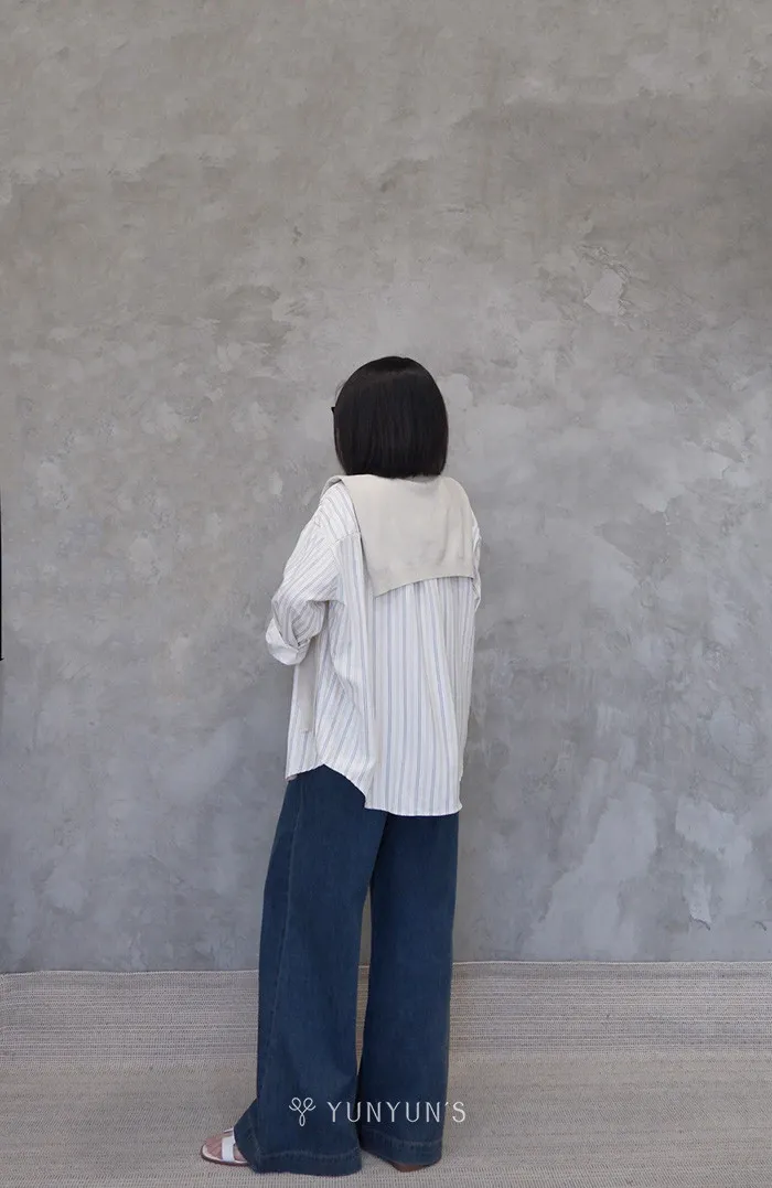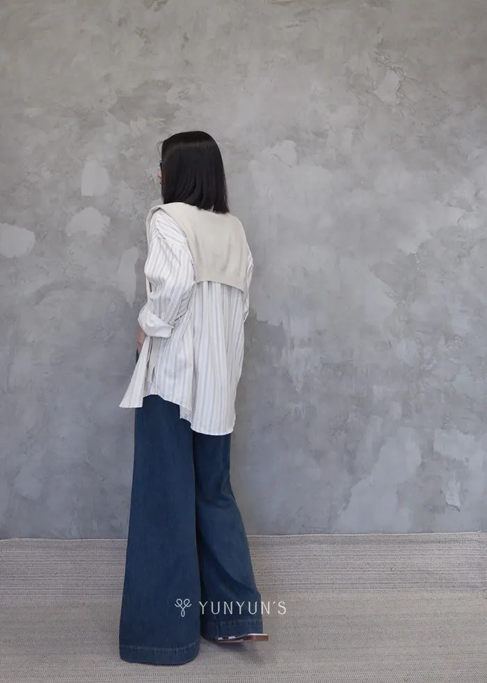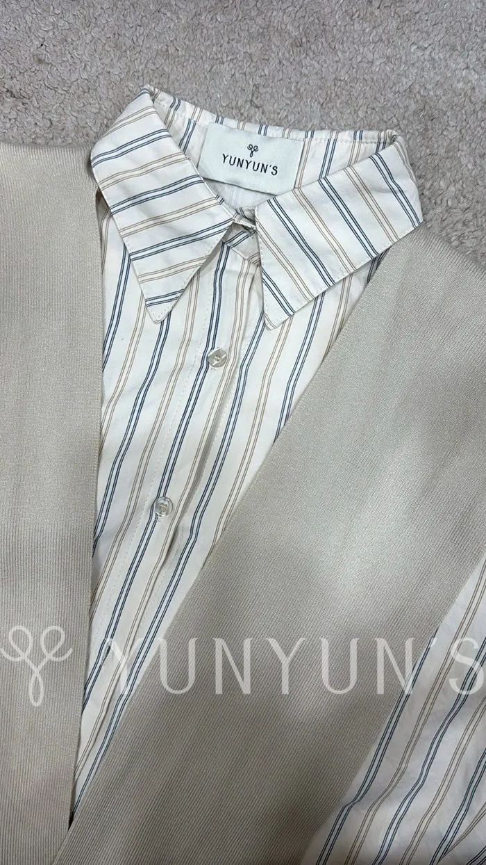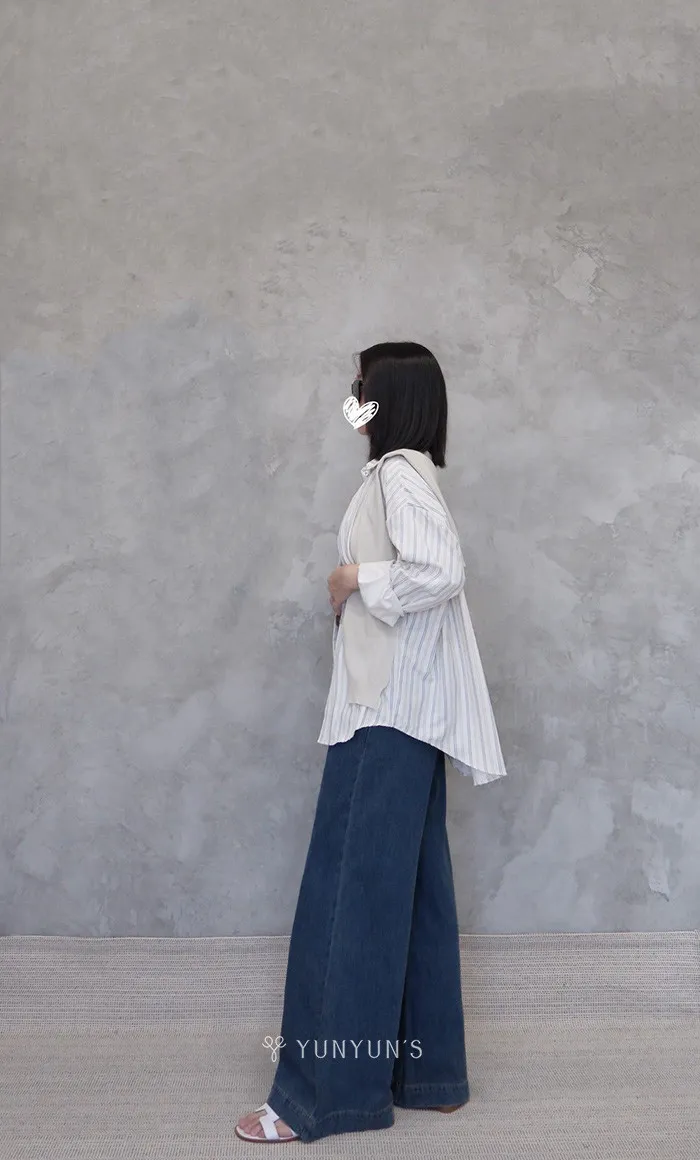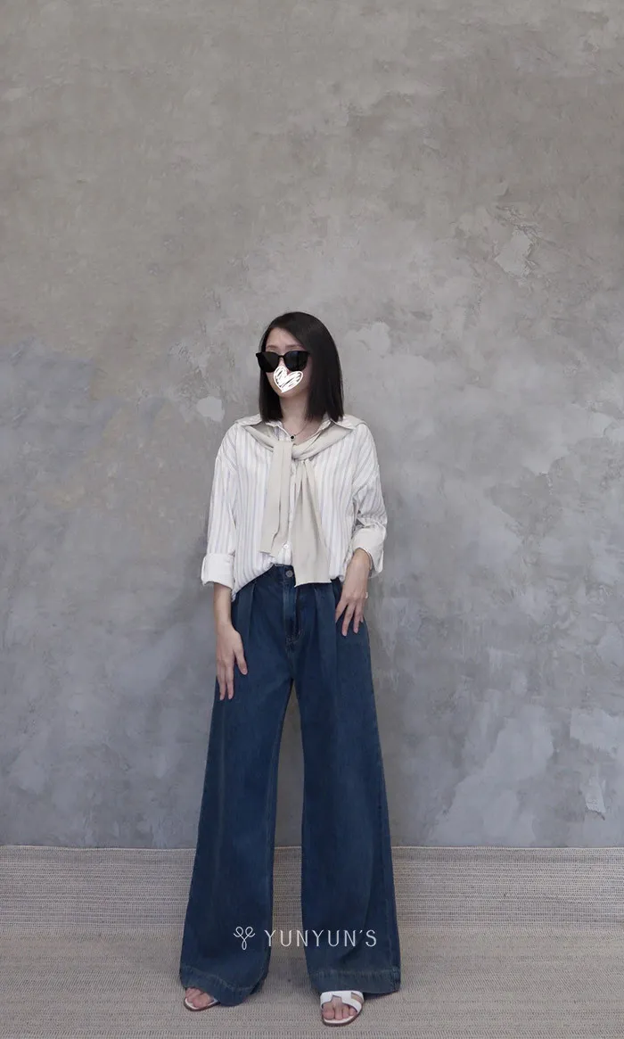 ・襯衫線條很漂亮溫柔奶油混著俐落藍線條、側邊弧度很美、材質不透
