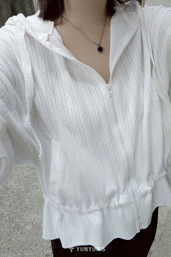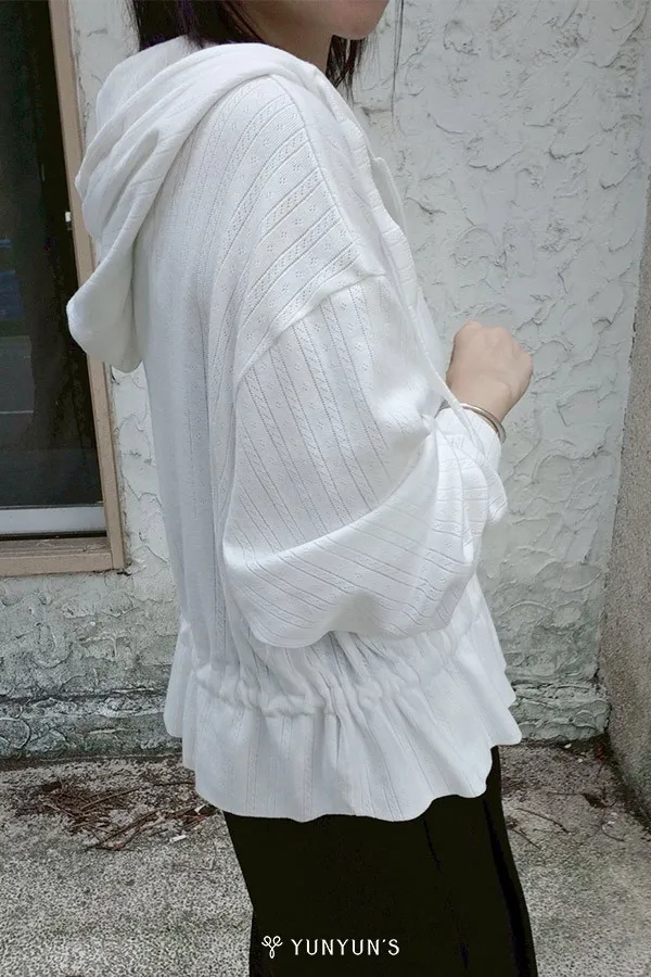 ・連帽拉鍊樣式、內部有抽繩(可自由調整鬆緊),收緊後下擺會有荷葉花邊感、帽子也有抽繩