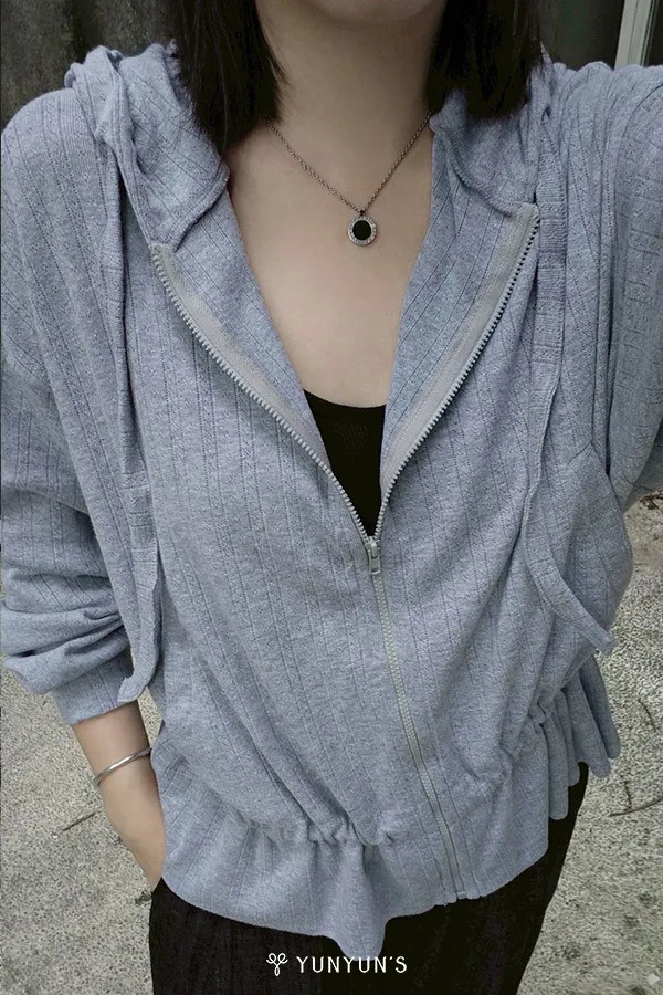 ・連帽拉鍊樣式、內部有抽繩(可自由調整鬆緊),收緊後下擺會有荷葉花邊感、帽子也有抽繩