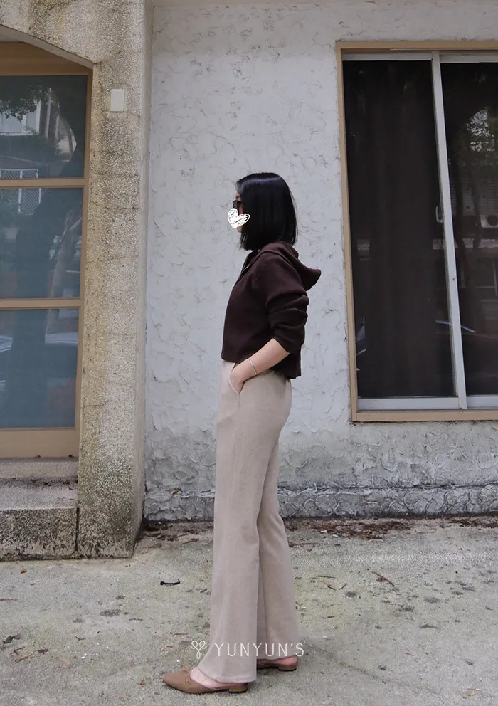 ・中車線、腰圍全鬆緊、微微喇叭褲腳顯腿長、兩側有口袋