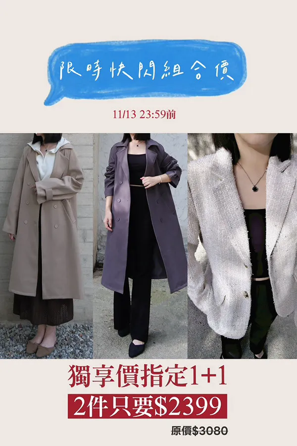 快閃活動$2399是指定兩件組(1件小香西外+1件長風衣/自選色)