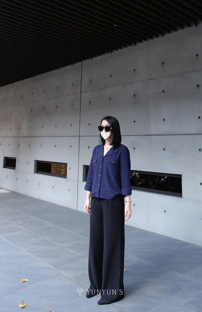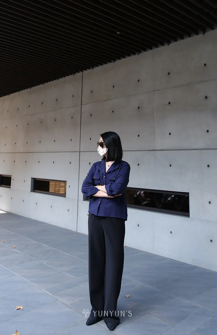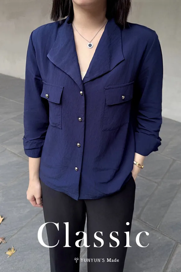 ・大翻領影子配上淡淡的小圓金釦質感很好,材質故意微微皺感好照顧