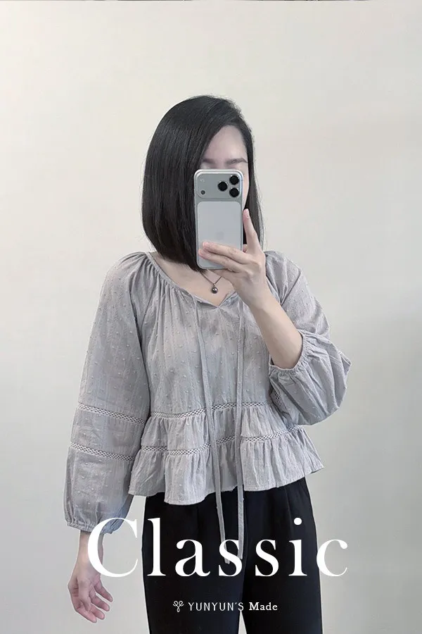 ・漂亮的壓花配上小格拼接更顯氣質,正面小翻領、無肩線,袖子寬鬆舒適,袖口有做鬆緊、下擺穿起來會有小小裙擺的感覺