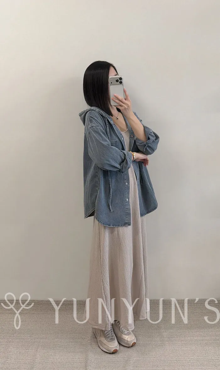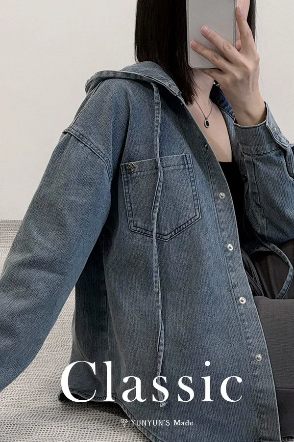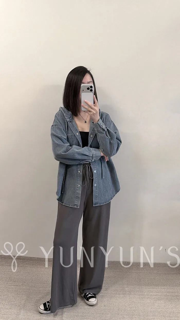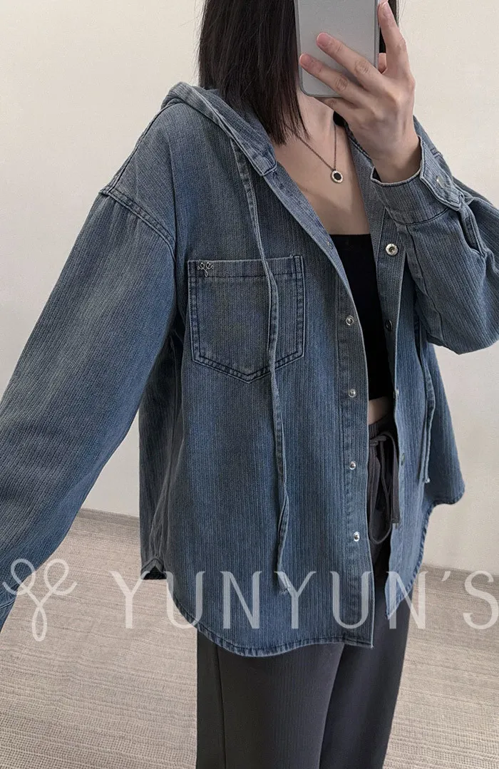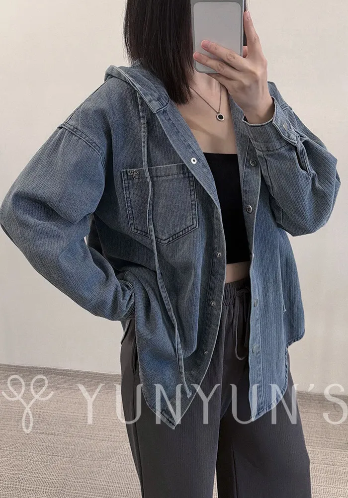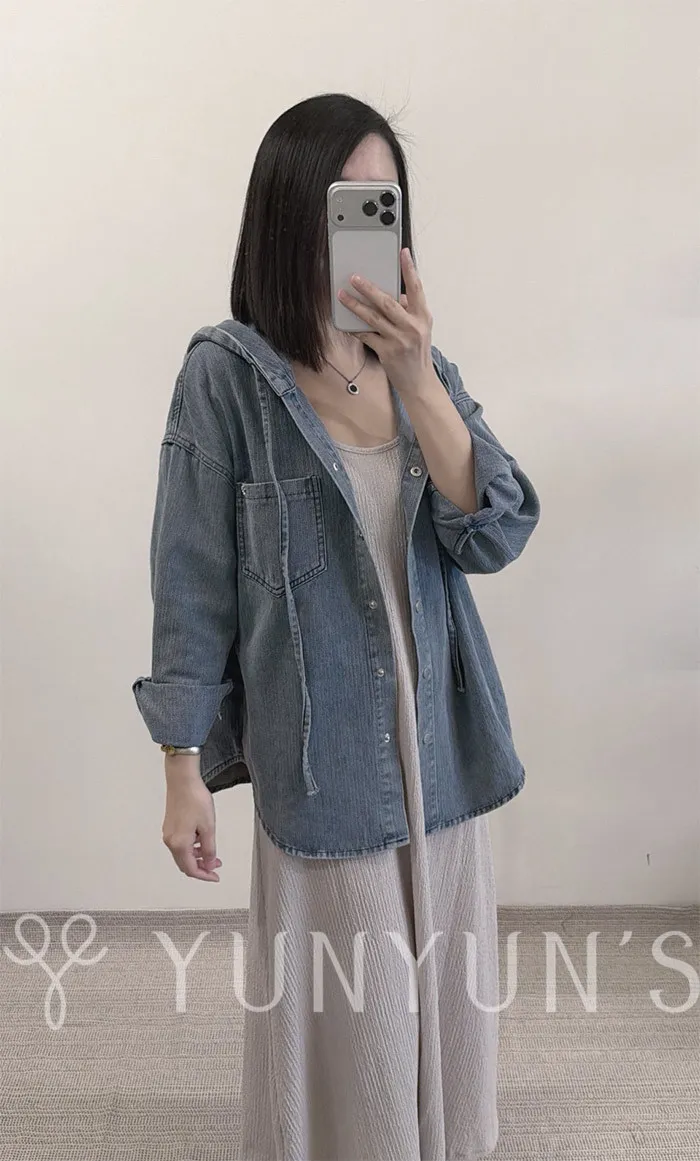 YUN連帽不易皺抽繩牛仔外套