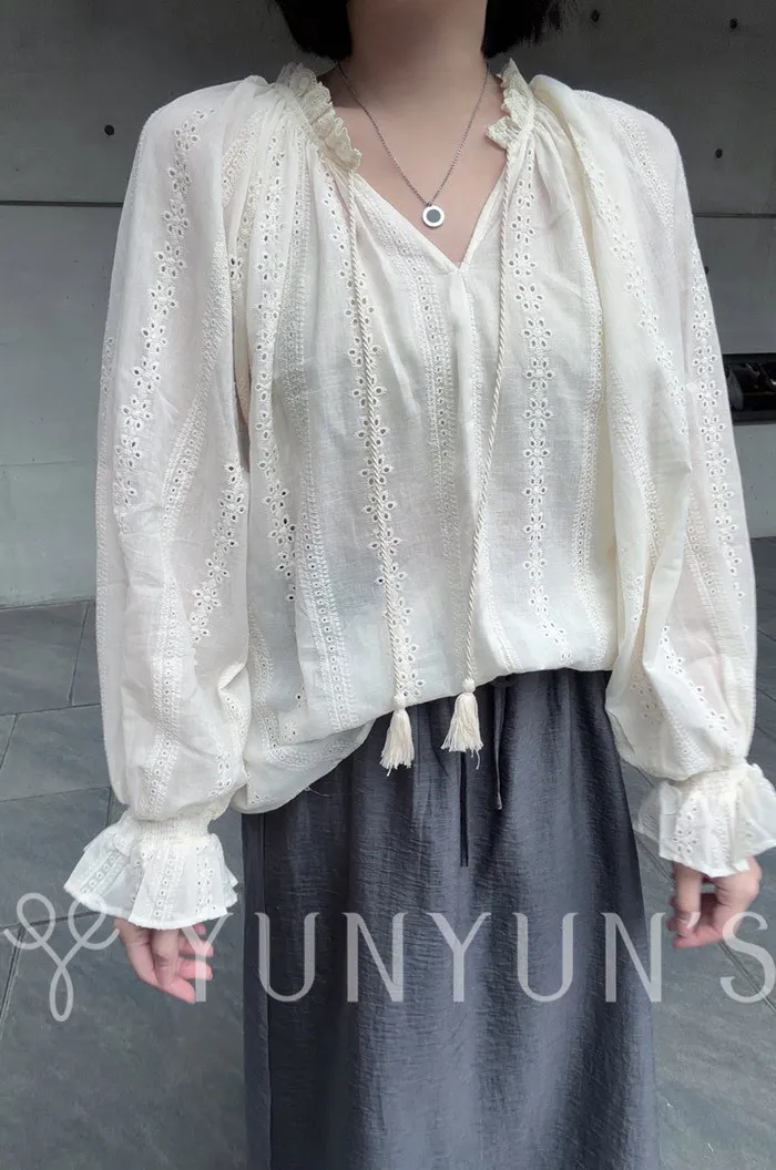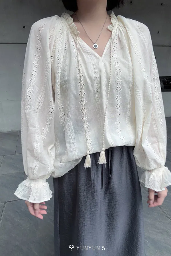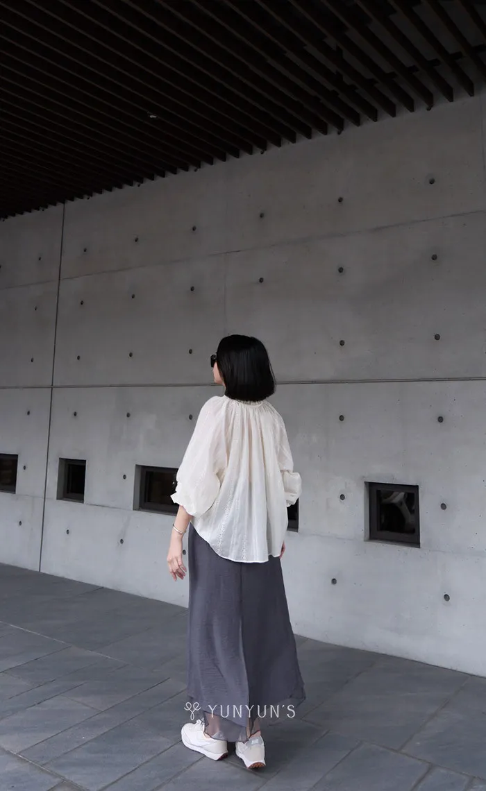 ・細節很多,從領口到袖口、正面小V領,背面領口有漂亮抓褶、袖口有舒適的精緻車工鬆緊緹花樣式