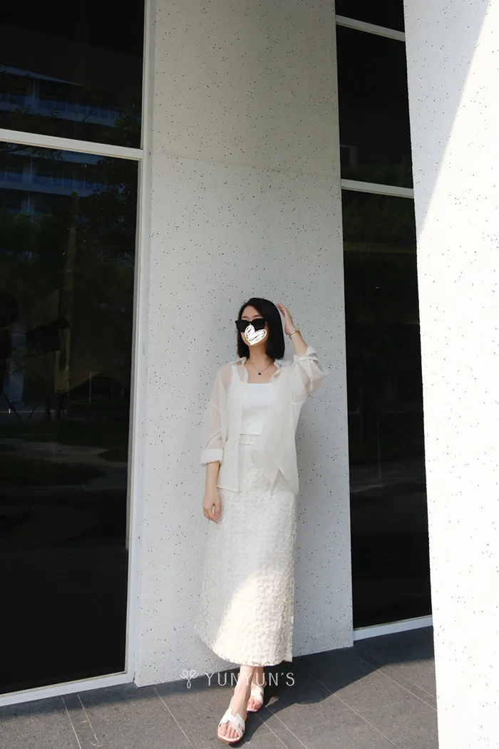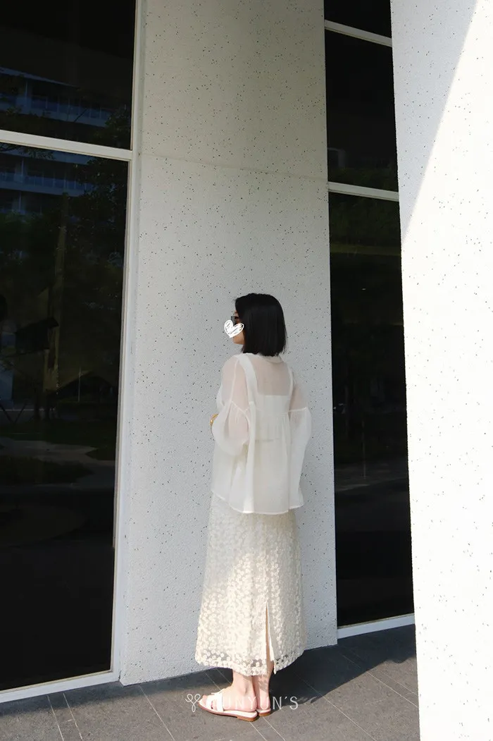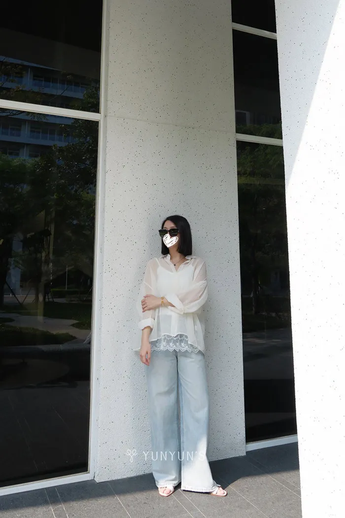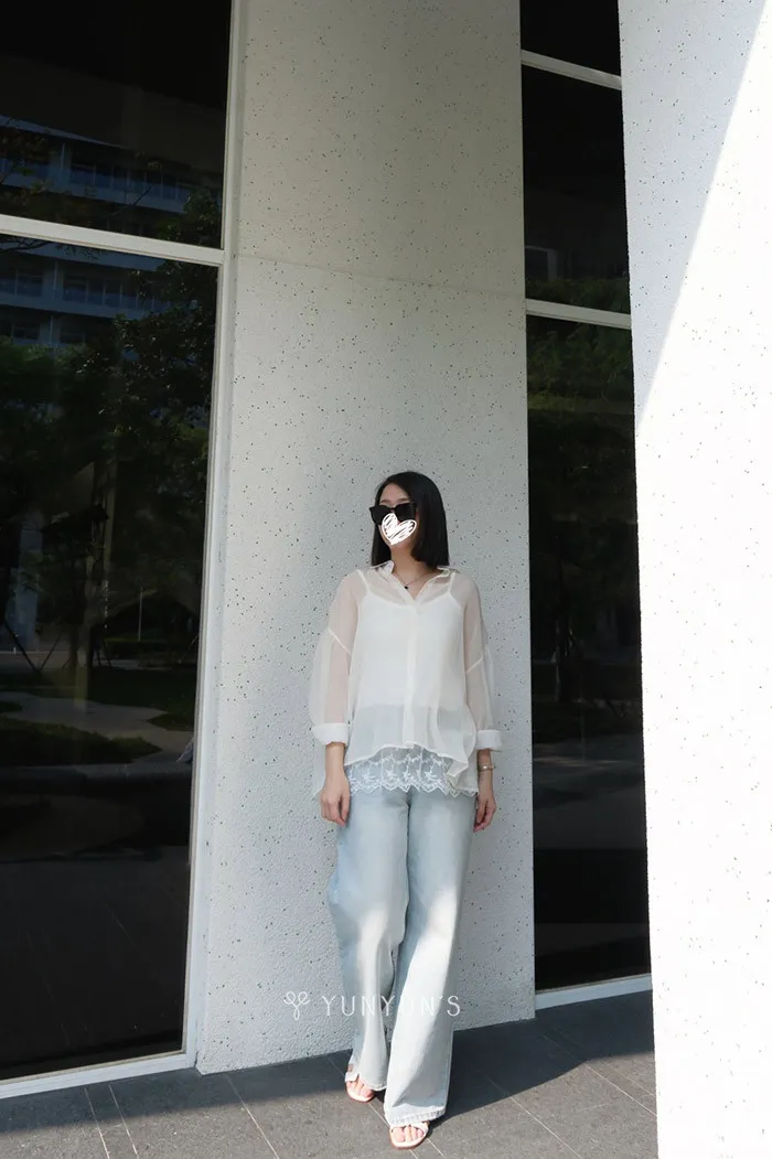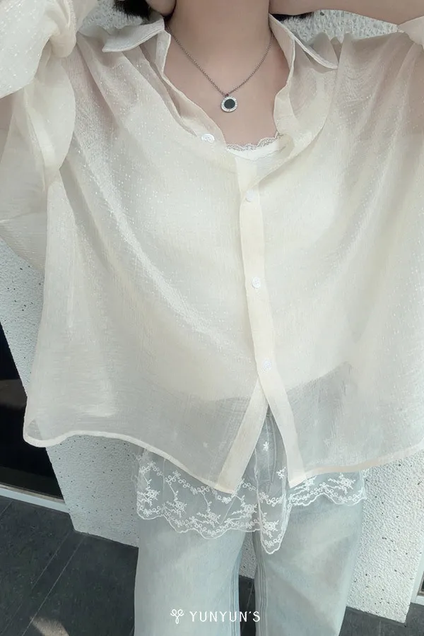 (杏)細閃透透襯衫+親膚蕾絲背心套裝