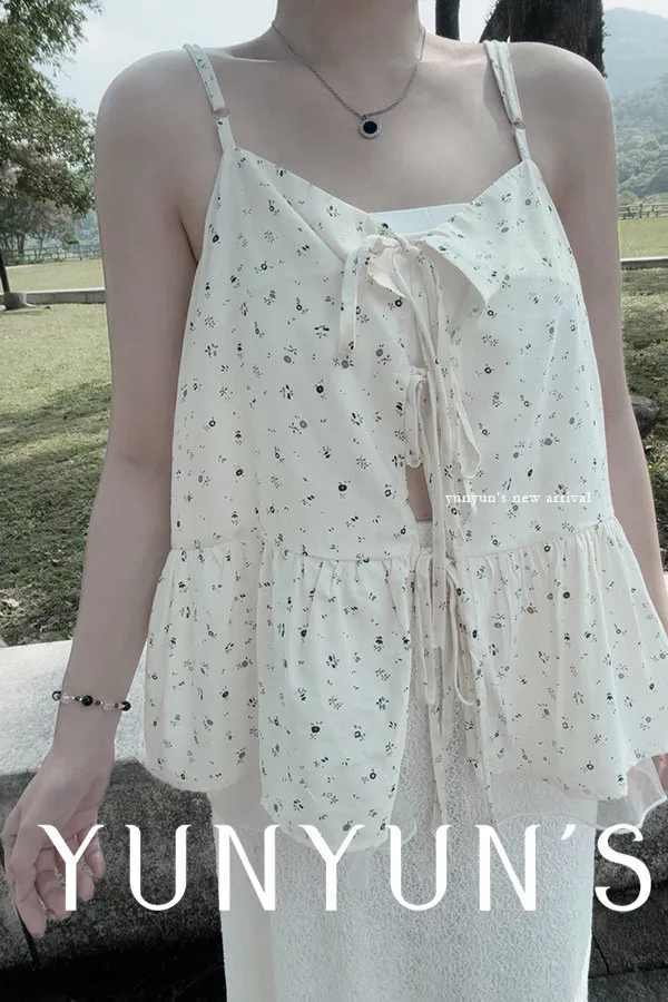 ・肩帶可調整,正面三個蝴蝶結綁帶(自由調整),雙面皆可穿,碎花很漂亮,下擺雙層的層次感.ᐟ